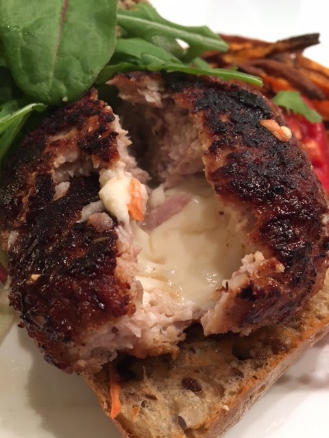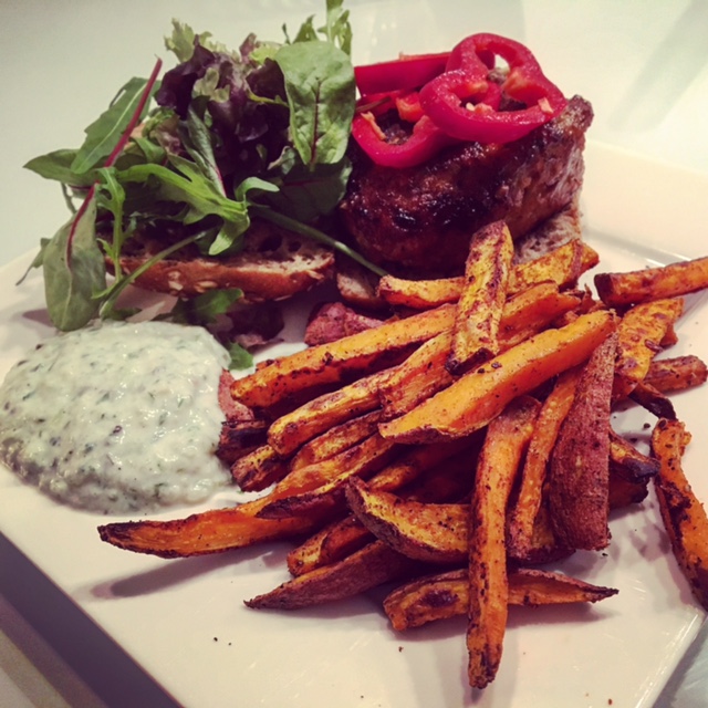 Ik mag het zelf eigenlijk niet zeggen, maar man man man wat was dit een heerlijk maaltje! Burgers van kippengehakt gevuld met mozzarella, zoete aardappel friet met pittige kruiden en zelfgemaakte tzatziki. Hier maak ik mijn vent dus echt blij mee, NORMAAL voedsel. Zoals hij dat noemt 😉