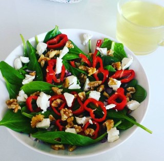 Leg de spinazie op een groot bord of in een grote schaal. Snijd de puntpaprika en rode ui en verdeel over de salade. Ook de geitenkaas snijd je in kleine stukjes. De walnoten heb ik in stukjes gebroken en over de salade gestrooid. Op het einde doe je er nog wat honing over heen, voor de zoete smaak. Ik ben dol op geitenkaas en door het in een salade te doen heb je toch een gezonde maaltijd!