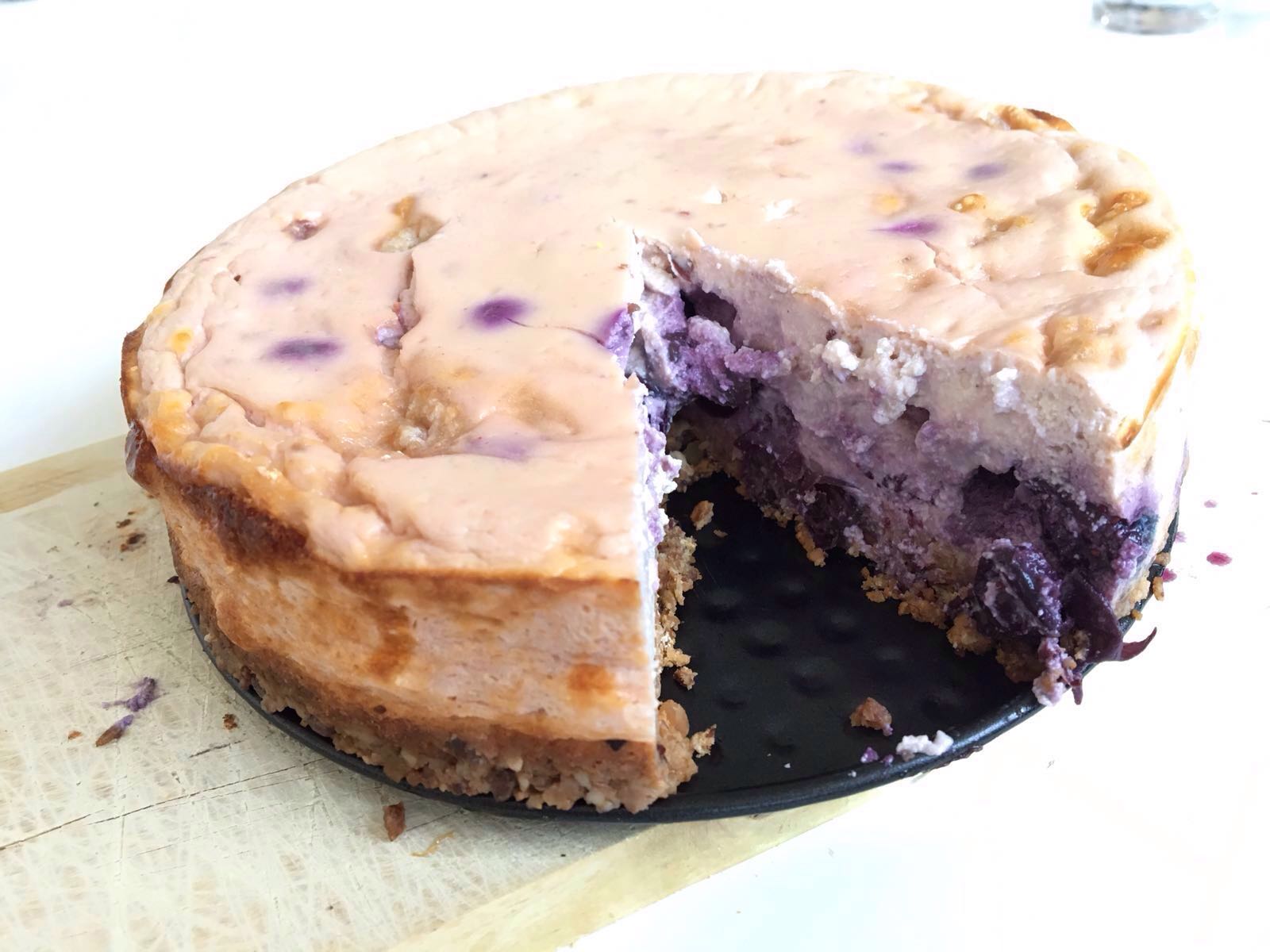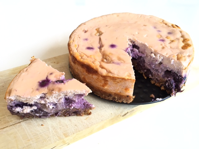 Vervolgens mix je alle ingrediënten voor de topping in een kom. Dit kan met een lepel of met de mixer. Als je dit geheel door elkaar hebt gemengd spatel je de blauwe bessen er door heen. Vervolgens gooi je dit geheel op de bodem van je cheesecake. En nu komt het meest lastige werk… geduld hebben tot je taart klaar is 😦