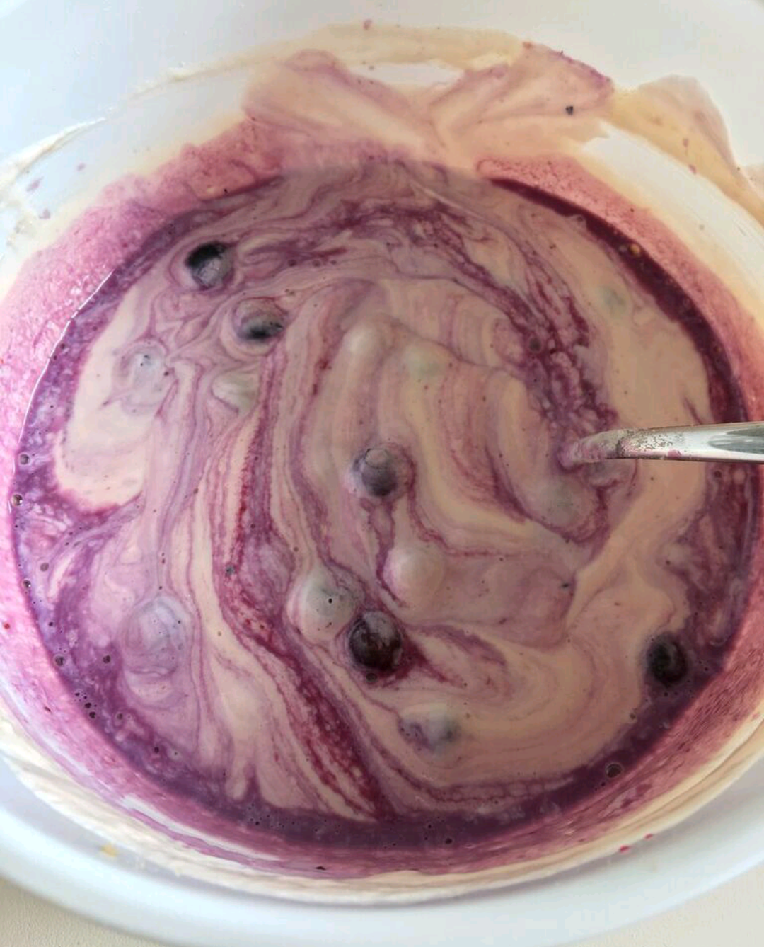 Zet een klein steelpannetje op het vuur en verwarm hierin de blauwe bessen. Voeg een of twee eetlepels water toe, zodat je een soort jam (alleen niet kleverig) krijgt.