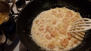 Wanneer je diepvries garnalen gebruikt, zorg er dan voor dat ze al ontdooid zijn als je begint met koken. Zet een pan heet water op om de pasta te koken (kook de pasta volgens verpakking). Ondertussen dat de pasta kookt ga je de saus maken. Snijd de uien in blokjes en pers de knoflook (ik heb echt vier tenen knoflook gebruikt, lekker stinken!). Pak een wokpan en doe hier een beetje kokosolie in. Bak de garnalen in de knoflook tot ze een mooie roze kleur krijgen. Voeg de uien toe en roerbak even door. Strooi er dan naar smaak zout en peper op en een flinke snuf cayenne peper. Wij houden van pittig eten dus ik strooi er wel wat op.. Je kan het natuurlijk ook gewoon weg laten! Maar de pittige garnalen geven wel een extra smaak in de pasta 🙂