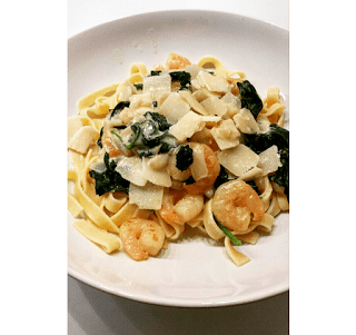 Let je wel even op de pasta? Dan is het goed. Vervolgens giet je de kookroom bij de garnalen en roer je het even door. Als de saus warm is, voeg dan steeds een paar handjes spinazie bij de saus. Zorg er voor dat de spinazie goed slinkt.