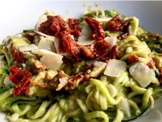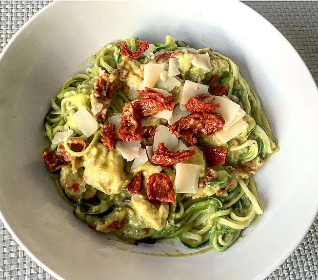 Snijd de kipfilet in blokjes en bak deze in een grote pan/wok in een beetje kokosolie. Terwijl je de kip bakt ga je de saus maken. Voeg in je keukenmachine de avocado’s (zonder pit), de teentjes knoflook, citroensap, parmezaanse kaas en de magere melk. Laat de machine flink draaien totdat je een gladde saus hebt. Het is ook lekker om er nog een scheutje olie van de zongedroogde tomaatjes door heen te doen. Dat was de saus! 🙂