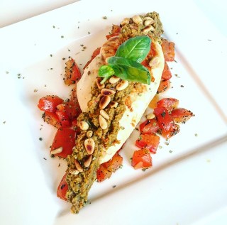 Als alles klaar is, leg je wat blokjes tomaat op je bord. Daarop leg je de kipfilet met wat courgette-puree erover. Bestrooi lekker met pijnboompitten en snel opeten die handel!