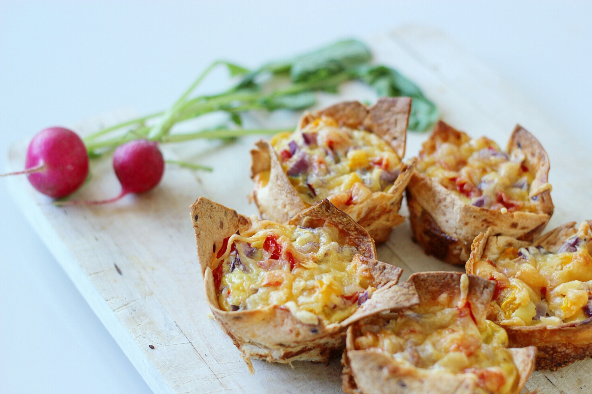 Spray je muffin vormpjes even goed in met bakspray of vet even in. Bekleed ieder muffin vormpje met een stukje tortilla. De twee overige stukjes scheur je in wat kleinere stukjes om de bodem nog extra mee te bekleden. Druk het een beetje aan.