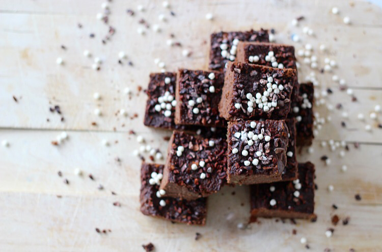 5. Bekleed een bakvorm met bakpapier. Vul de bakvorm met het beslag. Gooi eventueel wat cacaonibs op de bovenkant of noten als je dat lekker vindt!