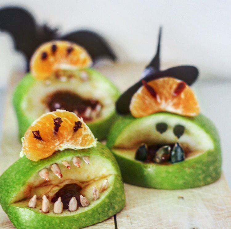 Snijd de appen in vieren. Snijd het stukje klokhuis weg. Snijd met een scherp mesje het mondje uit. Hierin steek je tandjes en wat jam als tong/bloed.