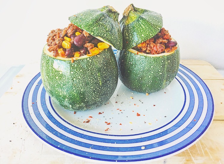 Dus.. er was een restje chili con carne over die wij afgelopen week in een wrapje hebben gegeten. En die heb ik nu lekker in een bolcourgette gestopt!
