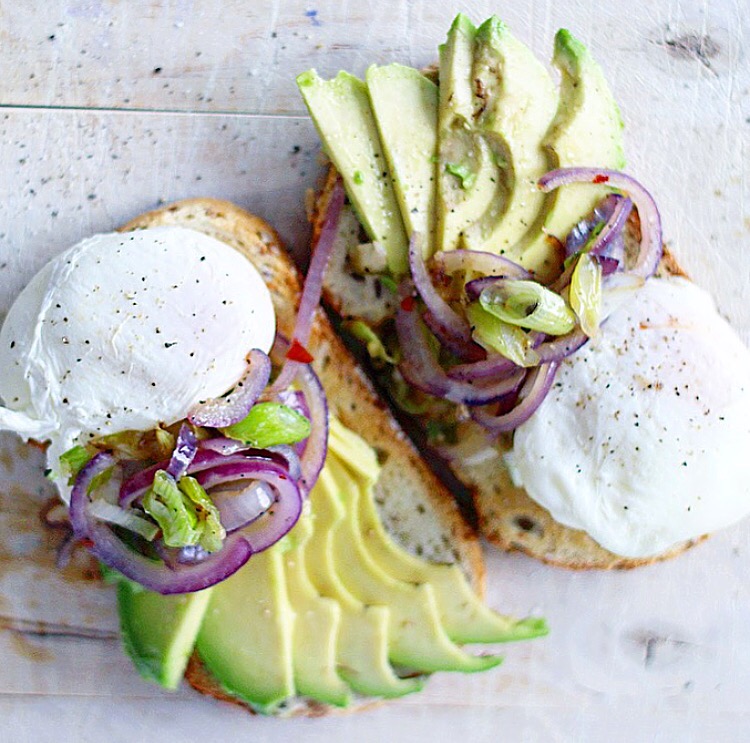 4. Rooster de spelt boterhammen in een broodrooster. Beleg de boterham met de plakjes avocado. Hierop leg je het ei en de gebakken uien. Strooi nog wat zout en peper over het ei.