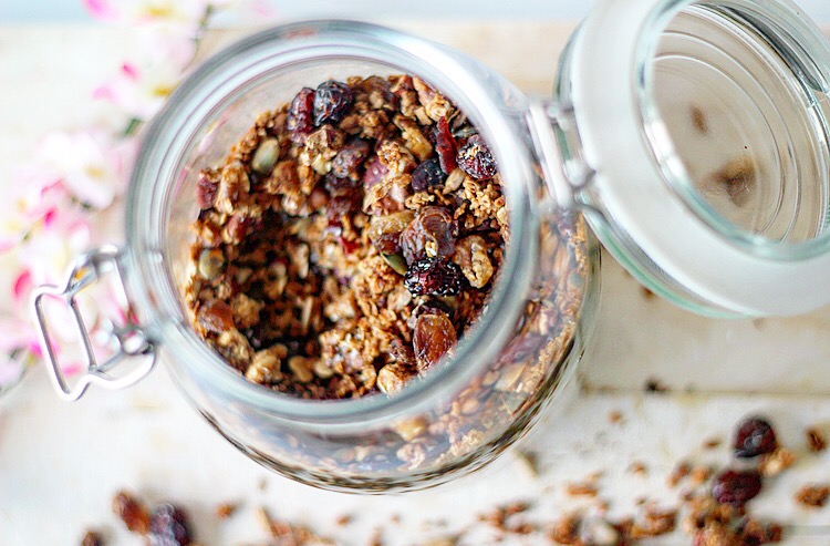 5. Laat het mengsel goed afkoelen en voeg daarna nog de rozijnen en cranberries toe. Bewaar in een afgesloten doos / jar!