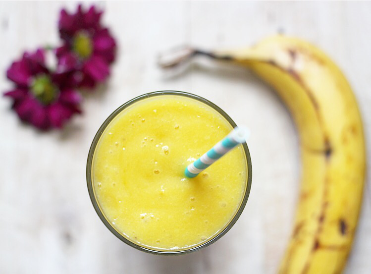Een recept kan je het bijna niet noemen, maar wel heel lekker!! Ik ben wel weer toe aan een beetje zon, dus dan maar zelf een beetje de zon in huis halen met deze gele smoothie. De smoothie bevat koolhydraten waardoor het lekker is als post-work out smoothie!