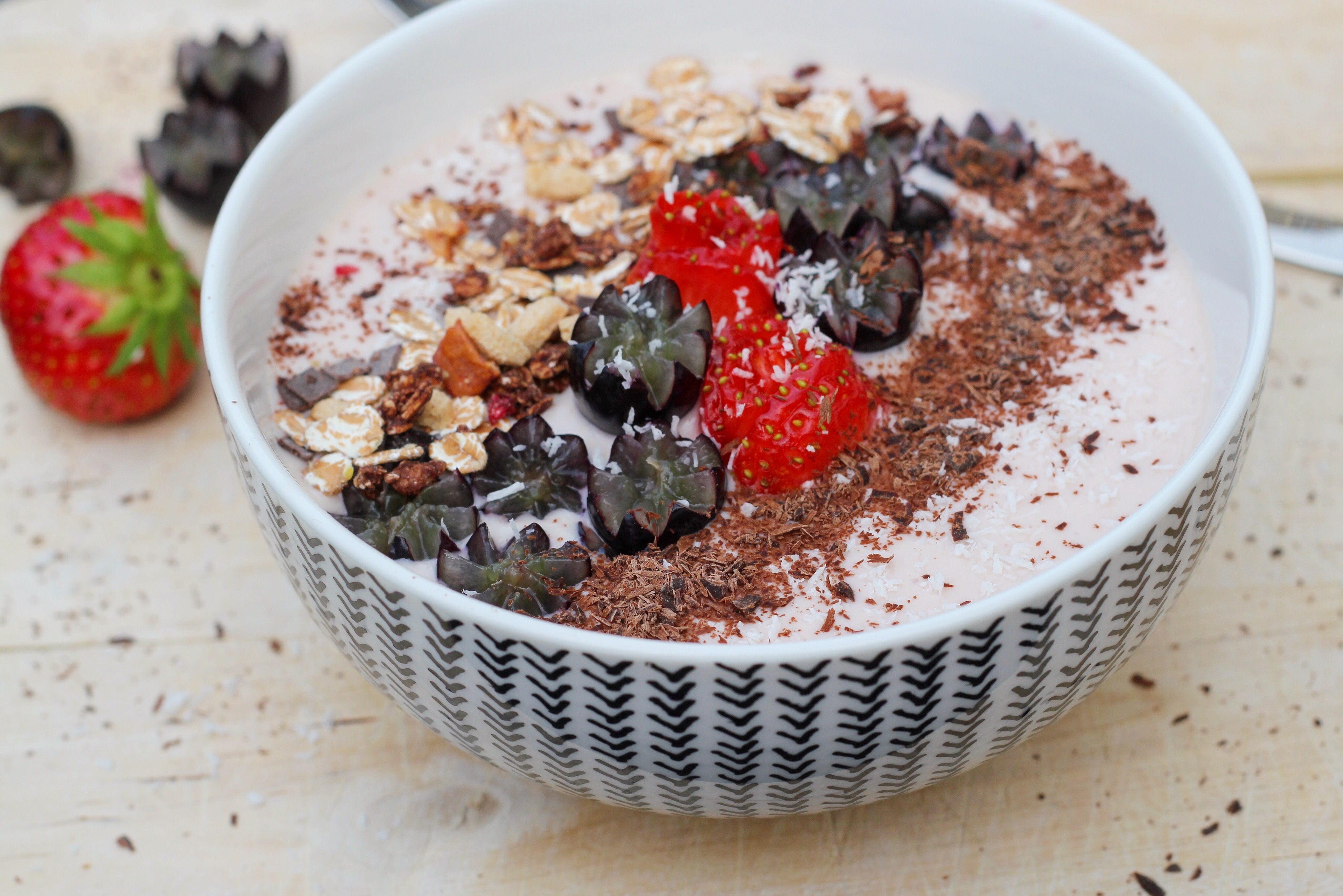 Smoothies hoef je niet altijd door een rietje te drinken! Gooi er je favoriete toppings bij, pak een lepel en smullen maar. Ik maakte deze variant met wat leftovers: aardbeien, banaan, druifjes enz.