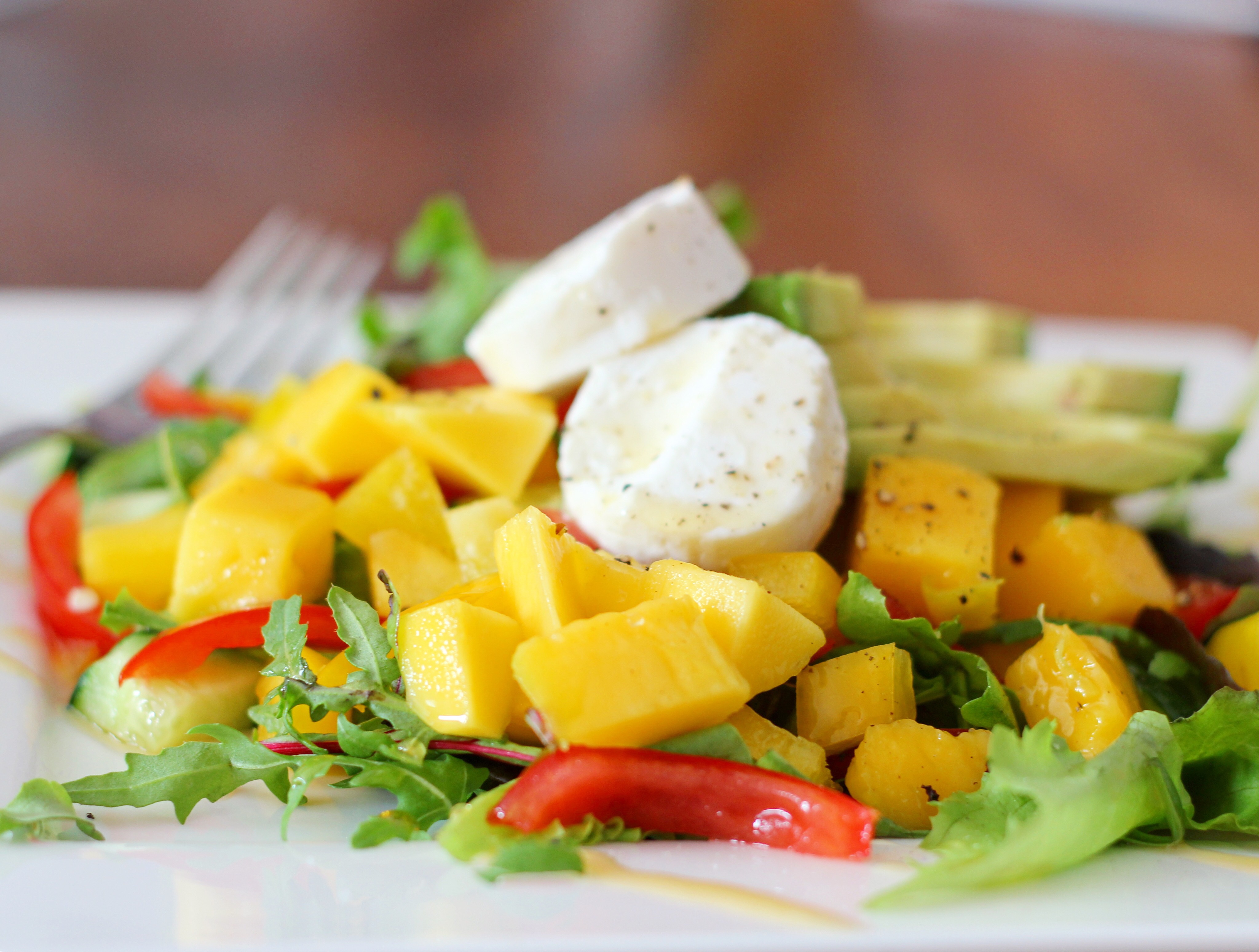 Deze simpele salade met mango, avocado en geitenkaas is echt mijn favoriet. Ik maak deze heel vaak, omdat hij simpel is, maar erg lekker! De zachte romige smaak van de avocado, het zoete van de mango en het hartige van de geitenkaas zijn voor mij echt een gouden combi. Ik zou zeggen, proef het zelf eens! Houd je niet van geitenkaas? Vervang het dan bijvoorbeeld voor feta!