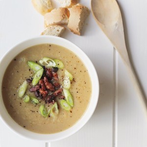 - Schenk de soep in twee kommen en verdeel de spekjes. Snijd de lente-ui in ringen en strooi over de soep.
