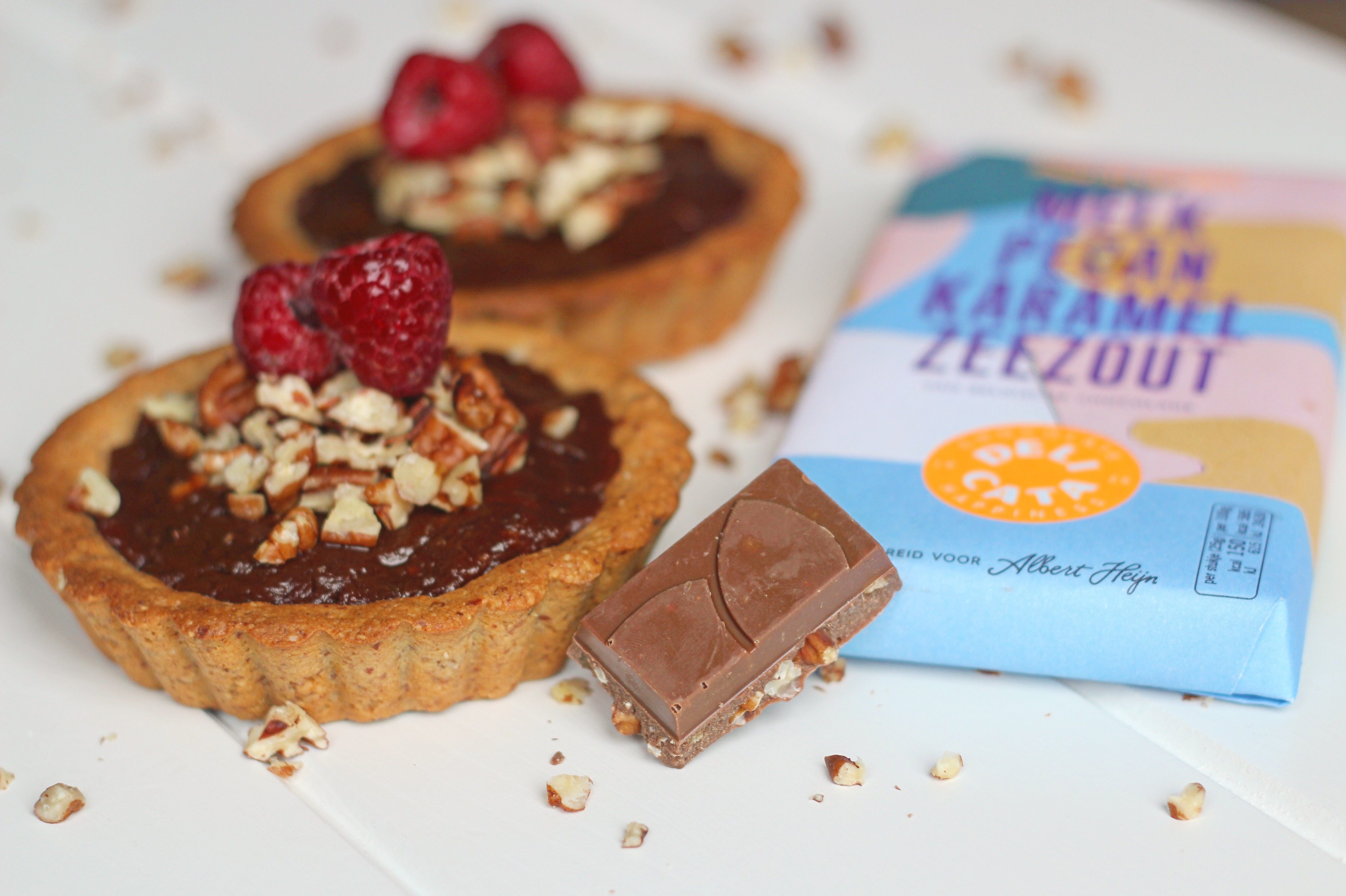 Laatst vertelde ik jullie al over de nieuwe smaken chocolade van Delicata bij Albert Heijn. Deze smaak is echt favoriet: melk – pecan – karamel – zeezout, yummy! Ik maakte daarom iets lekkers met mijn favo reep: deze heerlijke taartjes met chocolade-dadel vulling.