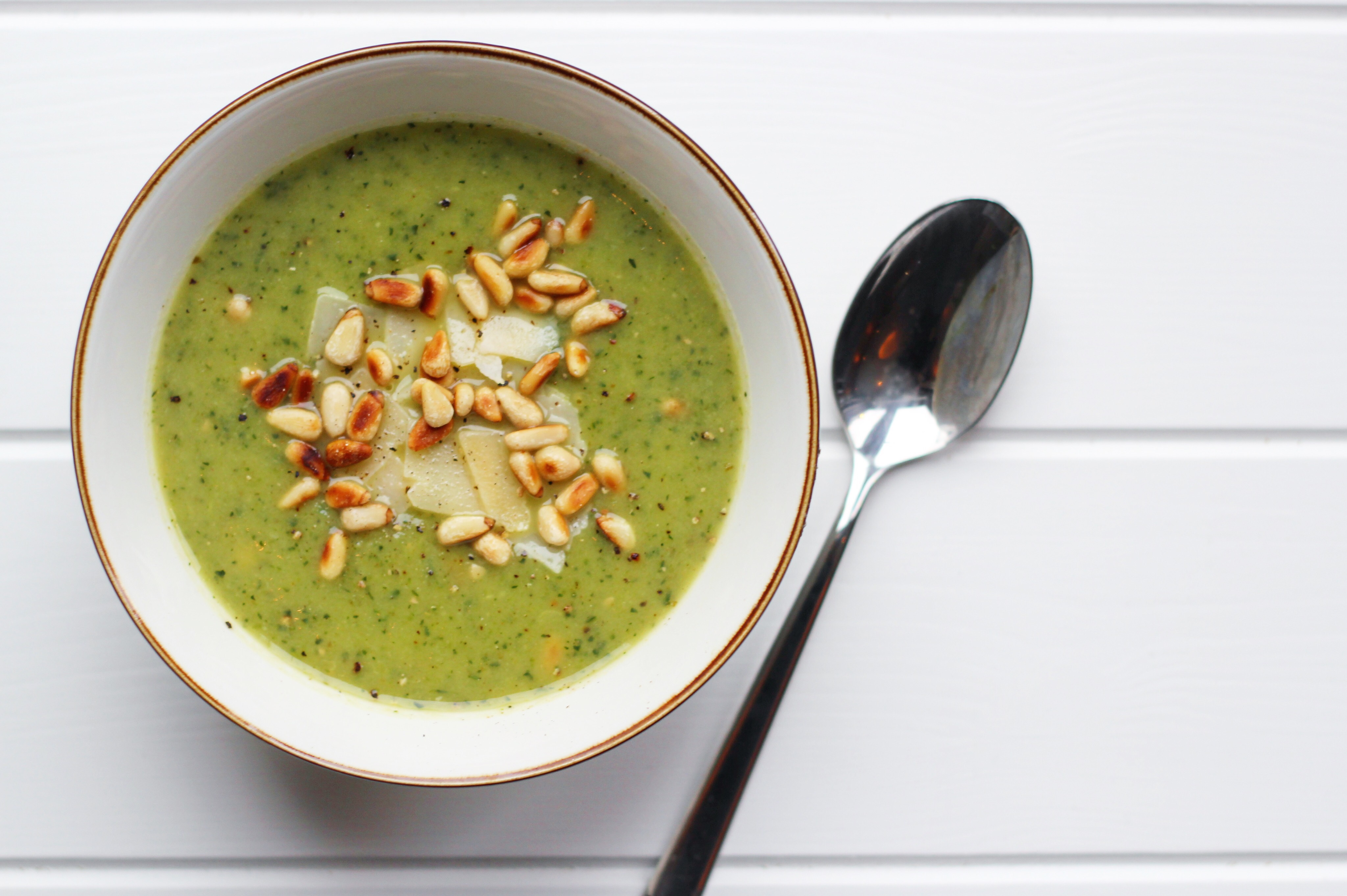 In eerste instantie wilde ik gewoon een simpel courgette soepje maken. Maar toen ben ik ineens gaan experimenteren! En toverde ik ineens deze mega lekker soep tevoorschijn. De pesto proef je heel subtiel in de soep, maar de Parmezaanse kaas en pijnboompitten maken het écht af. Dit kan je uiteraard ook weglaten als je minder vetten wilt eten.