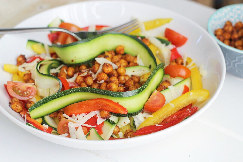Ik vind het altijd zo leuk dat “probeersels” zo goed kunnen uitpakken. Ik had dus het idee om een salade van rauwe courgette te maken. Uiteindelijk heb ik er gewoon van alles in gedaan wat mij lekker leek en dat pakte heel goed uit! De geroosterde kikkererwten dienen als “croutons” maar dan gezonder, echt jammie.