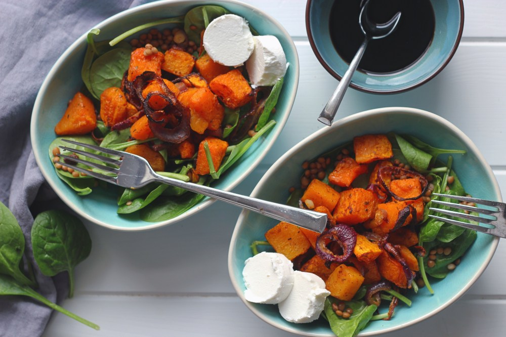 - Verdeel de spinazie en de linzen over twee borden en daarop de pompoen blokjes uit de oven. Voeg nog wat geitenkaas toe en eventueel de dressing (kan ook apart).