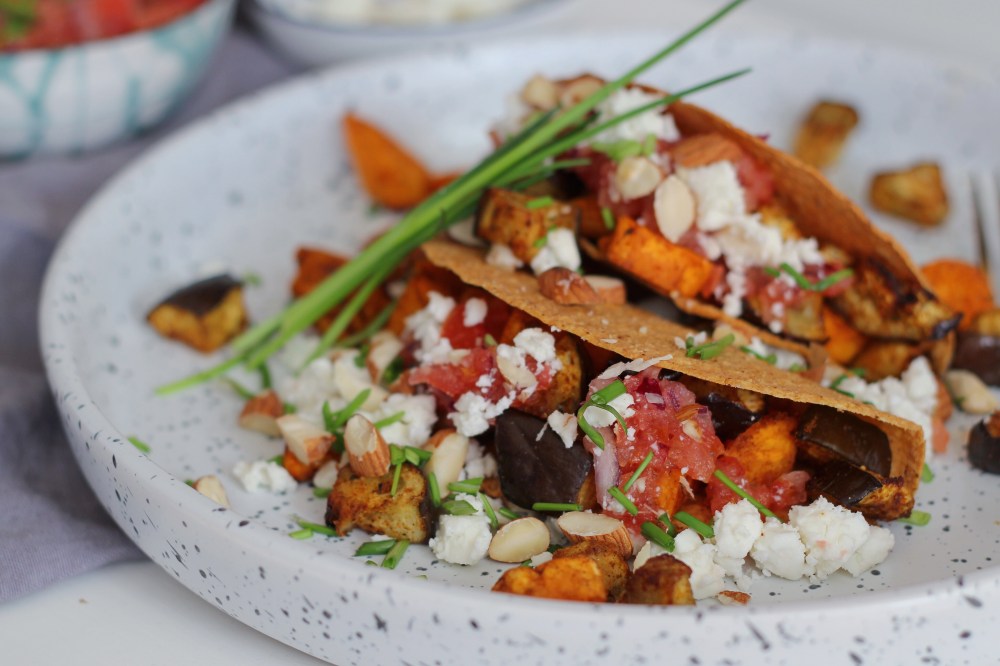 - Stop de taco’s even in de oven (zoals beschreven op de verpakking), vul ze daarna met een laagje zoete aardappel en aubergine, een laagje tomaten salsa, wat feta, amandelen en bieslook en herhaal dit nog een keer (als het past).